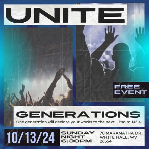 2024 UNITE! Generations was held on October 13, 2024, 6:30 PM at Trinity Assembly of God in Fairmont, WV. Approximately 780 people, representing 10 area churches, united as one to pray against barriers that divide us, and to pray for and bless the coming generation!