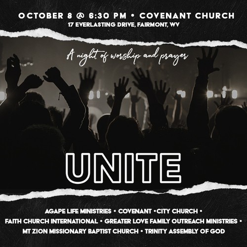 The First UNITE! was held on October 8, 2023, 6:30 PM, at Covenant Church in Fairmont. Approximately 600 people from 7 area churches gathered to worship together and to pray against Spiritual Strongholds in Marion County: Abuse, Addiction, Corruption, Family & Marriage, Generational Curses, Poverty, Racism, and Religious Spirit - - asking God to tear down these hindrances in our communities so that souls are won for Christ and lives are changed. The Holy Spirit's presence was powerful; gatherers remained a long time after the service to fellowship with one another in unity.